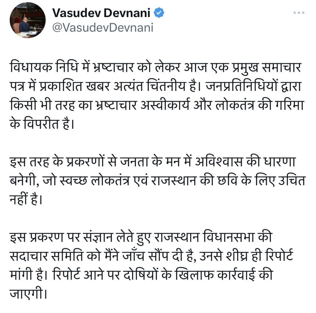 राजस्थान विधानसभा अध्यक्ष वासुदेव देवनानी ने भी इस पूरे प्रकरण पर गहरा संज्ञान लिया है।